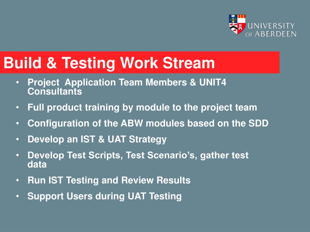 Build & Testing Work Stream • Project Application Team Members & UNIT4 Consultants • Full product training by module to the project team • Configuration of the ABW modules based on the SDD • Develop an IST & UAT Strategy • Develop Test Scripts, Test Scenario’s, gather test data • Run IST Testing and Review Results • Support Users during UAT Testing