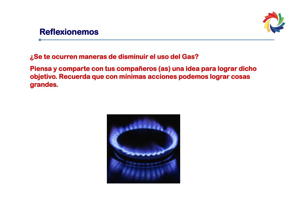 Reflexionemos ¿Se te ocurren maneras de disminuir el uso del Gas? Piensa y comparte con tus compañeros (as) una idea para lograr dicho objetivo. Recuerda que con mínimas acciones podemos lograr cosas grandes.