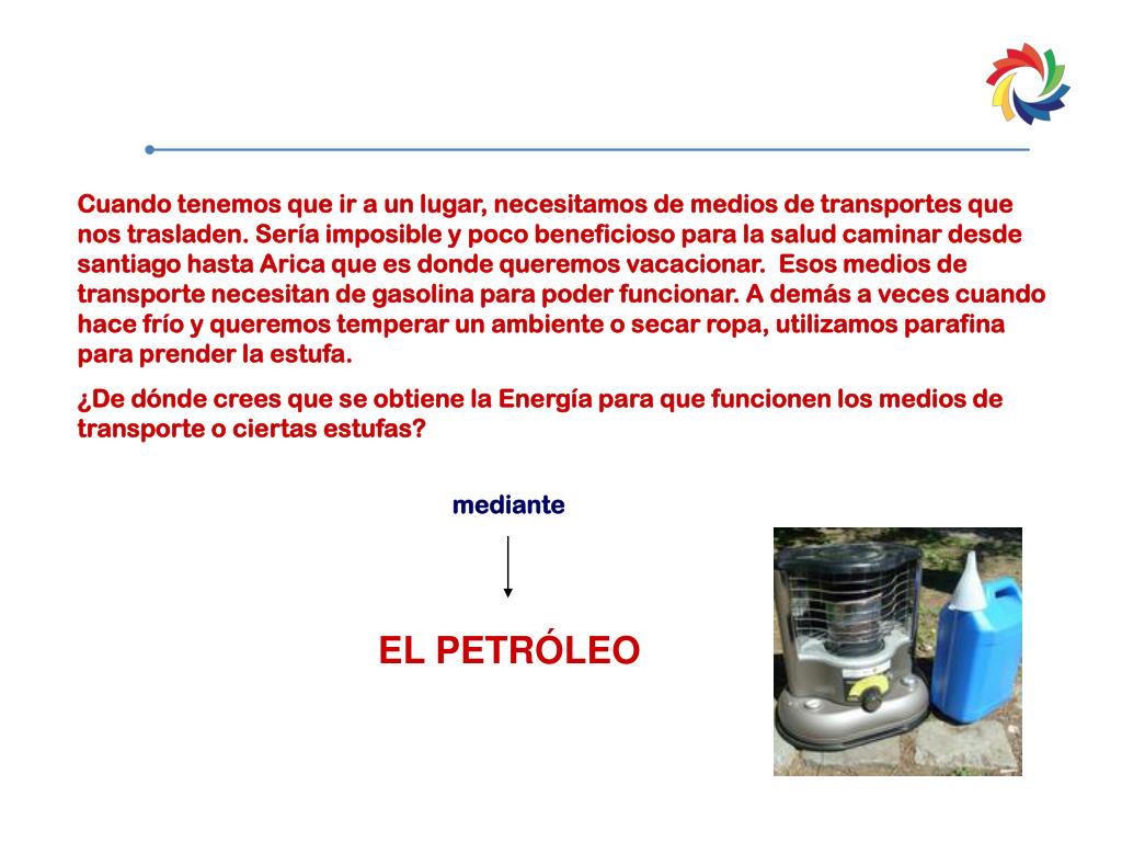 Cuando tenemos que ir a un lugar, necesitamos de medios de transportes que nos trasladen. Sería imposible y poco beneficioso para la salud caminar desde santiago hasta Arica que es donde queremos vacacionar. Esos medios de transporte necesitan de gasolina para poder funcionar. A demás a veces cuando hace frío y queremos temperar un ambiente o secar ropa, utilizamos parafina para prender la estufa. ¿De dónde crees que se obtiene la Energía para que funcionen los medios de transporte o ciertas estufas? mediante EL PETRÓLEO