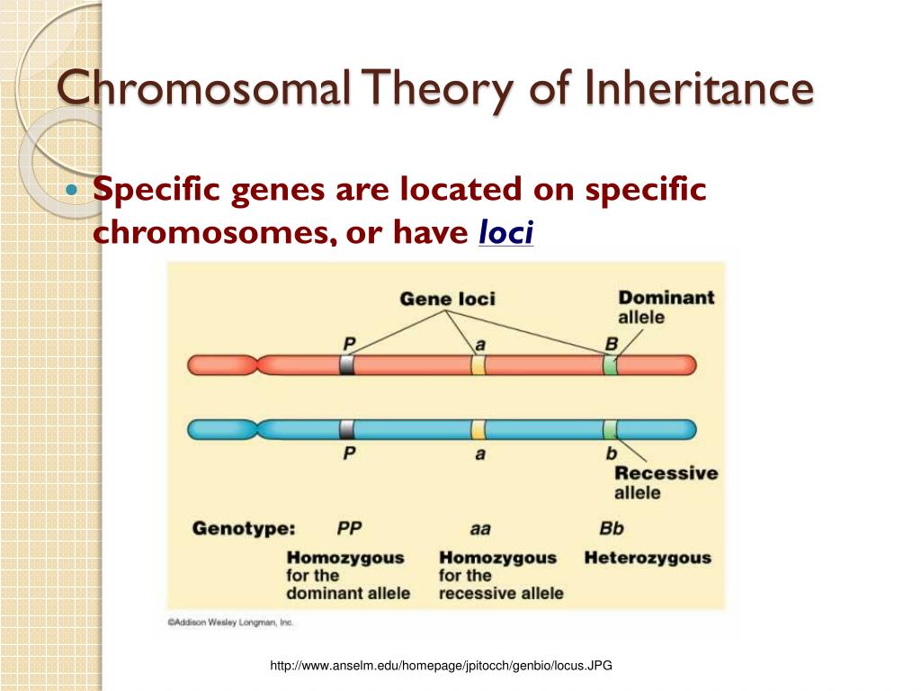 Chromosomal Theory of Inheritance • Specific genes are located on specific chromosomes, or have loci http://www.anselm.edu/homepage/jpitocch/genbio/locus.JPG