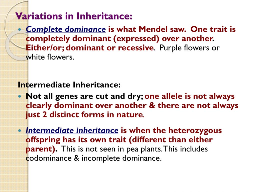 Variations in Inheritance: • Complete dominanceis what Mendel saw. One trait is completely dominant (expressed) over another.Either/or; dominant or recessive. Purple flowers or white flowers. Intermediate Inheritance: • Not all genes are cut and dry; one allele is not always clearly dominant over another & there are not always just 2 distinct forms in nature. • Intermediate inheritanceis when the heterozygous offspring has its own trait (different than either parent). This is not seen in pea plants. This includes codominance & incomplete dominance.