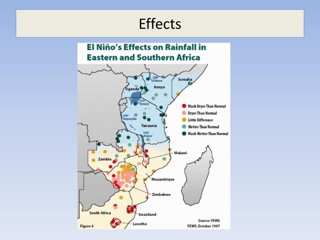 Warm water spreads from the west Pacific and the Indian Ocean to the east Pacific. It takes the rain with it, causing extensive drought in the western Pacific and rainfall in the normally dry eastern Pacific. • El Niño's warm current of nutrient-poor tropical water, heated by its eastward passage in the Equatorial Current, replaces the cold, nutrient-rich surface water of the Humboldt Current. • When El Niño conditions last for many months, extensive ocean warming occurs • Economic impact to local fishing for an international market can be serious.