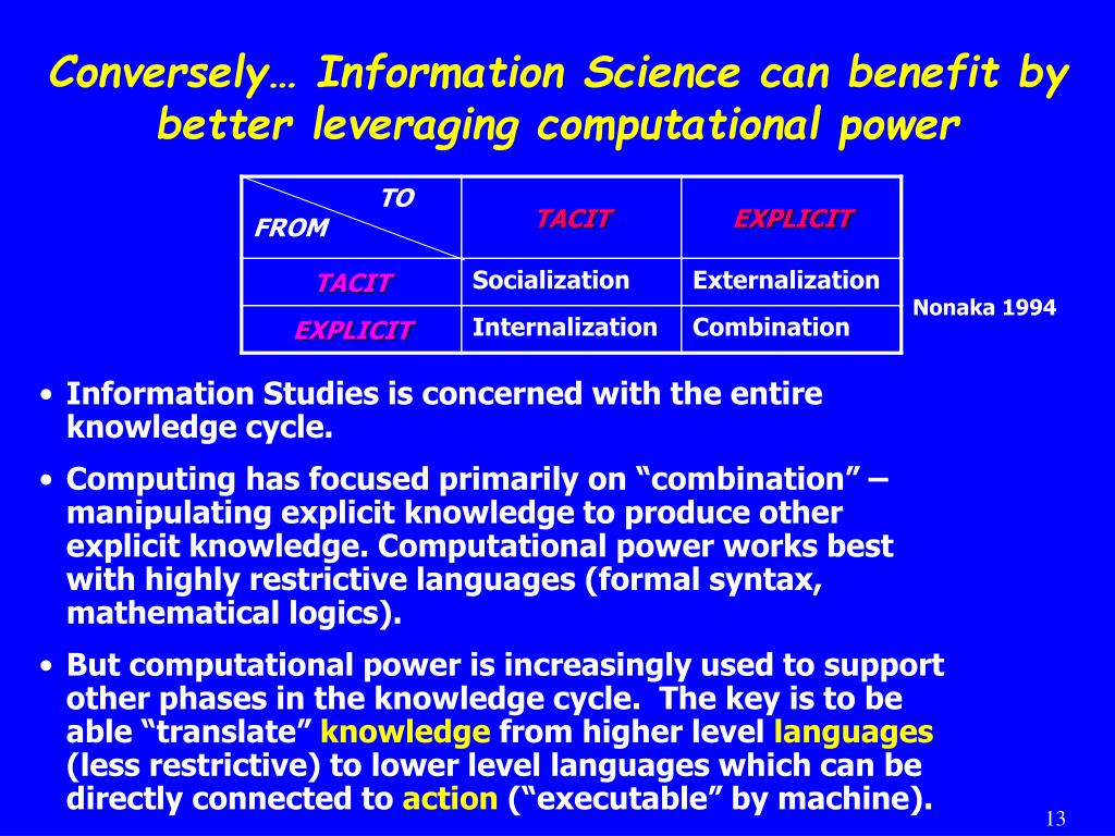 Conversely… Information Science can benefit by better leveraging computational power • Information Studies is concerned with the entire knowledge cycle. • Computing has focused primarily on “combination” – manipulating explicit knowledge to produce other explicit knowledge. Computational power works best with highly restrictive languages (formal syntax, mathematical logics). • But computational power is increasingly used to support other phases in the knowledge cycle. The key is to be able “translate” knowledge from higher level languages (less restrictive) to lower level languages which can be directly connected to action (“executable” by machine). Nonaka 1994