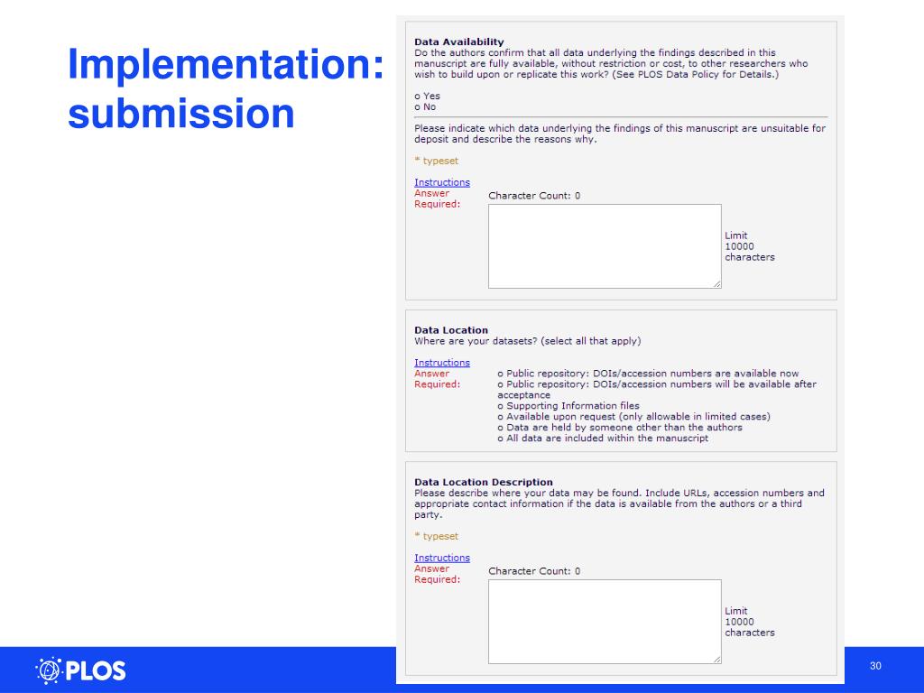 Aims of New PLOS Data Policy • Ensuring access to the underlying data should be an intrinsic part of the scientific publishing process • To ensure that all steps, from authoring to publication, capture data and its associated metadata well and then present them in optimal human and machine-readable formats to all readers and users of PLOS-published research