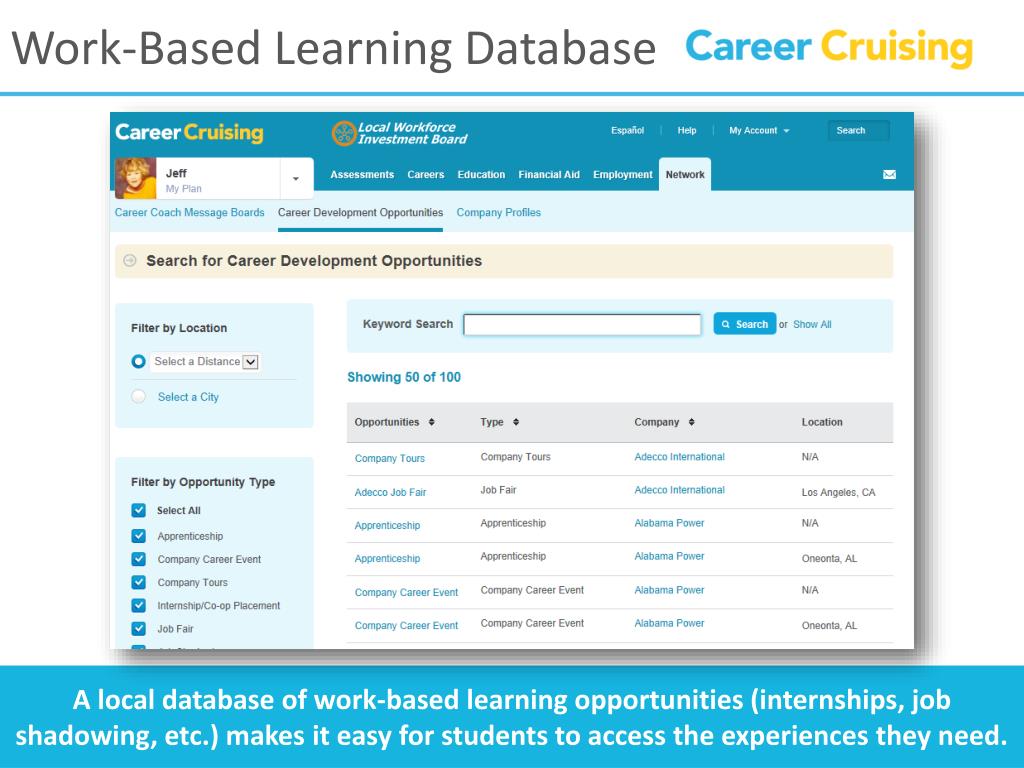 Work-Based Learning Database A local database of work-based learning opportunities (internships, job shadowing, etc.) makes it easy for students to access the experiences they need.