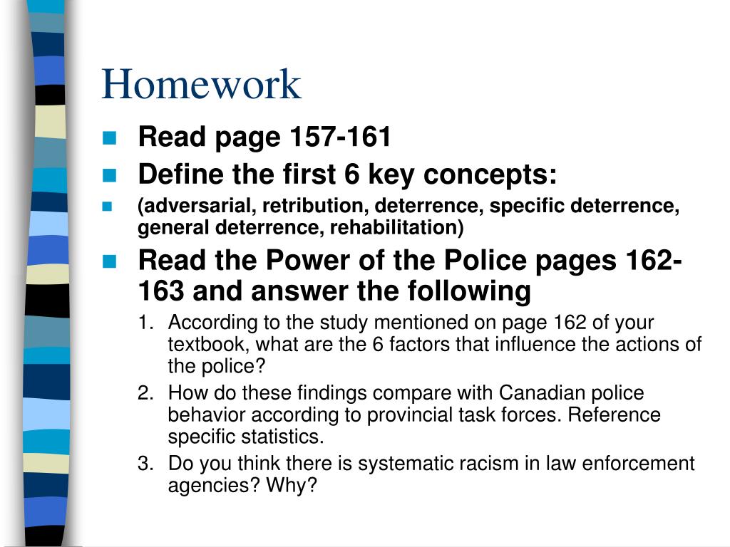 Homework • Read page 157-161 • Define the first 6 key concepts: • (adversarial, retribution, deterrence, specific deterrence, general deterrence, rehabilitation) • Read the Power of the Police pages 162-163 and answer the following • According to the study mentioned on page 162 of your textbook, what are the 6 factors that influence the actions of the police? • How do these findings compare with Canadian police behavior according to provincial task forces. Reference specific statistics. • Do you think there is systematic racism in law enforcement agencies? Why?