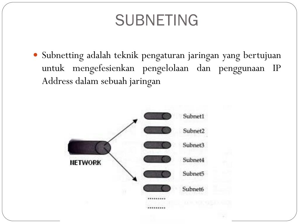 SUBNETING • Subnetting adalah teknik pengaturan jaringan yang bertujuan untuk mengefesienkan pengelolaan dan penggunaan IP Address dalam sebuah jaringan