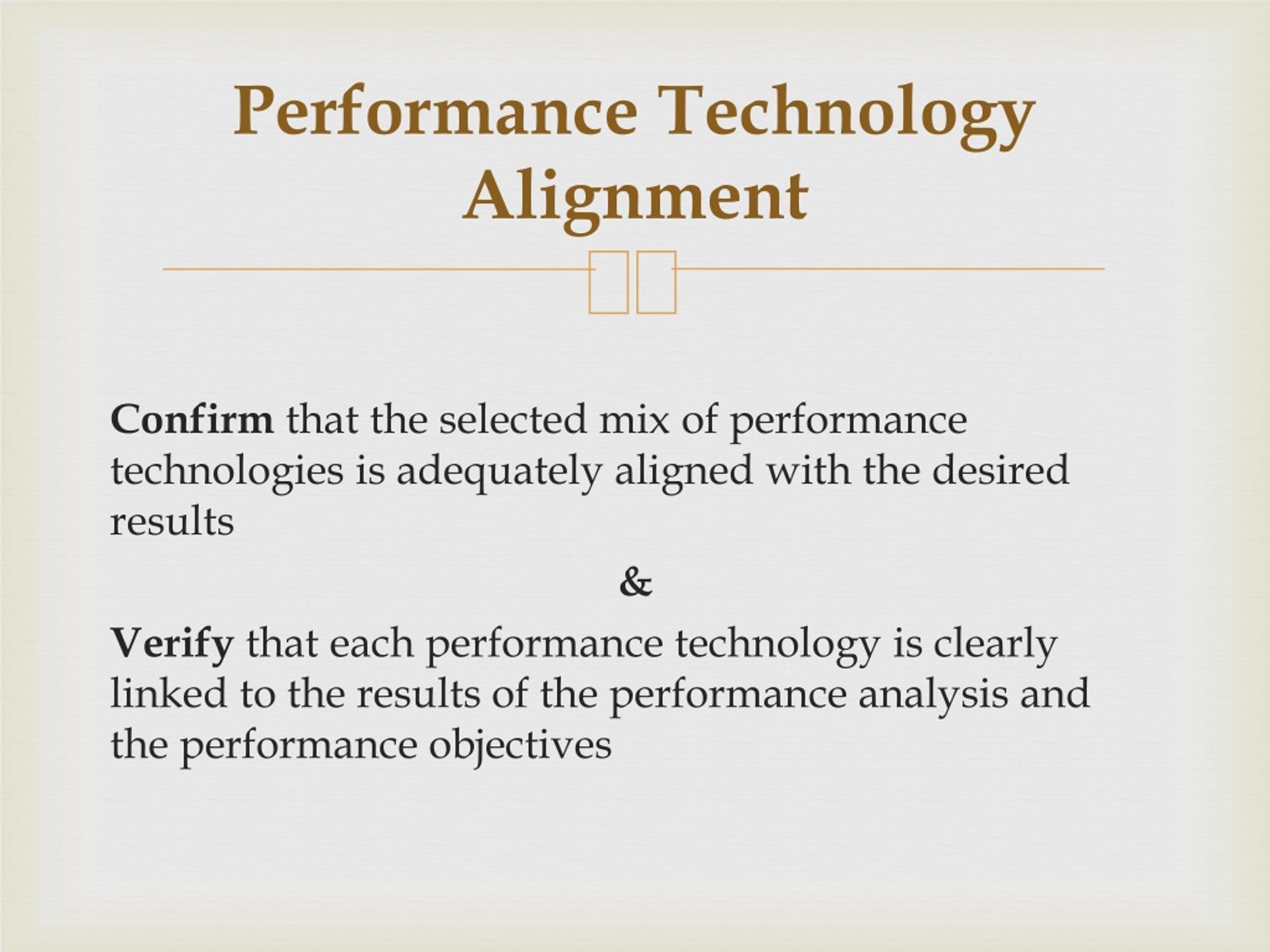 Performance Technology Alignment Confirm that the selected mix of performance technologies is adequately aligned with the desired results & Verify that each performance technology is clearly linked to the results of the performance analysis and the performance objectives