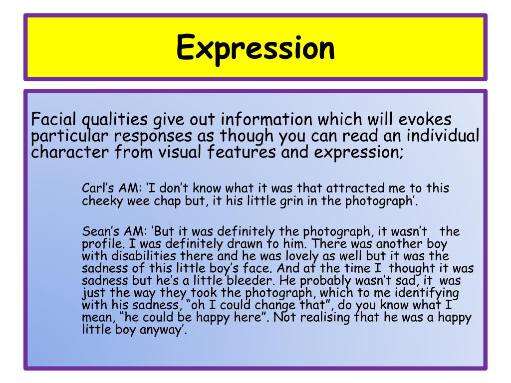 Expression Facial qualities give out information which will evokes particular responses as though you can read an individual character from visual features and expression; Carl’s AM: ‘I don’t know what it was that attracted me to this cheeky wee chap but, it his little grin in the photograph’. Sean’s AM: ‘But it was definitely the photograph, it wasn’t the profile. I was definitely drawn to him. There was another boy with disabilities there and he was lovely as well but it was the sadness of this little boy’s face. And at the time I thought it was sadness but he’s a little bleeder. He probably wasn’t sad, it was just the way they took the photograph, which to me identifying with his sadness, “oh I could change that”, do you know what I mean, “he could be happy here”. Not realising that he was a happy little boy anyway’.