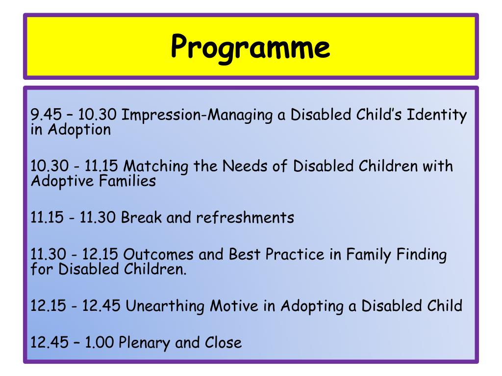 Programme 9.45 – 10.30 Impression-Managing a Disabled Child’s Identity in Adoption 10.30 - 11.15 Matching the Needs of Disabled Children with Adoptive Families 11.15 - 11.30 Break and refreshments 11.30 - 12.15 Outcomes and Best Practice in Family Finding for Disabled Children. 12.15 - 12.45 Unearthing Motive in Adopting a Disabled Child 12.45 – 1.00 Plenary and Close