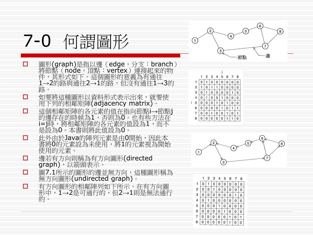 7-0 何謂圖形 • 圖形(graph)是指以邊(edge,分支:branch)將節點(node,頂點:vertex)連接起來的物件,其形式如下。這個圖形的意義為有通往1→2的路與通往2→1的路,但沒有通往1→3的路。 • 如要將這種圖形以資料形式表示出來,就要使用下列的相鄰矩陣(adjacency matrix)。 • 這個相鄰矩陣的各元素的值在指向節點i→節點j的邊存在的時候為1,否則為0。也有些方法在i=j時,將相鄰矩陣的各元素的值設為1,而不是設為0。本書則將此值設為0。 • 此外由於Java的陣列元素是由0開始,因此本書將0的元素設為未使用,將1的元素視為開始使用的元素。 • 邊若有方向則稱為有方向圖形(directed graph),以箭頭表示。 • 圖7.1所示的圖形的邊並無方向,這種圖形稱為無方向圖形(undirected graph)。 • 有方向圖形的相鄰陣列如下所示。在有方向圖形中,1→2是可通行的,但2→1則是無法通行的。