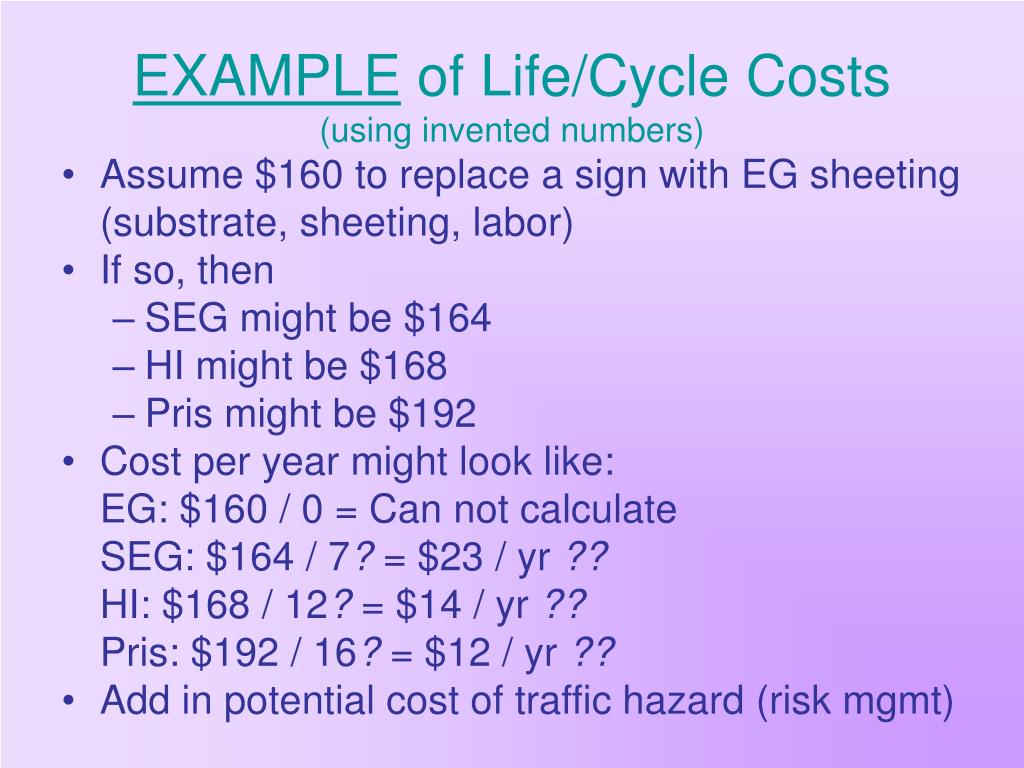 EXAMPLE of Life/Cycle Costs(using invented numbers) • Assume $160 to replace a sign with EG sheeting (substrate, sheeting, labor) • If so, then • SEG might be $164 • HI might be $168 • Pris might be $192 • Cost per year might look like: EG: $160 / 0 = Can not calculate SEG: $164 / 7? = $23 / yr ?? HI: $168 / 12? = $14 / yr ?? Pris: $192 / 16? = $12 / yr ?? • Add in potential cost of traffic hazard (risk mgmt)