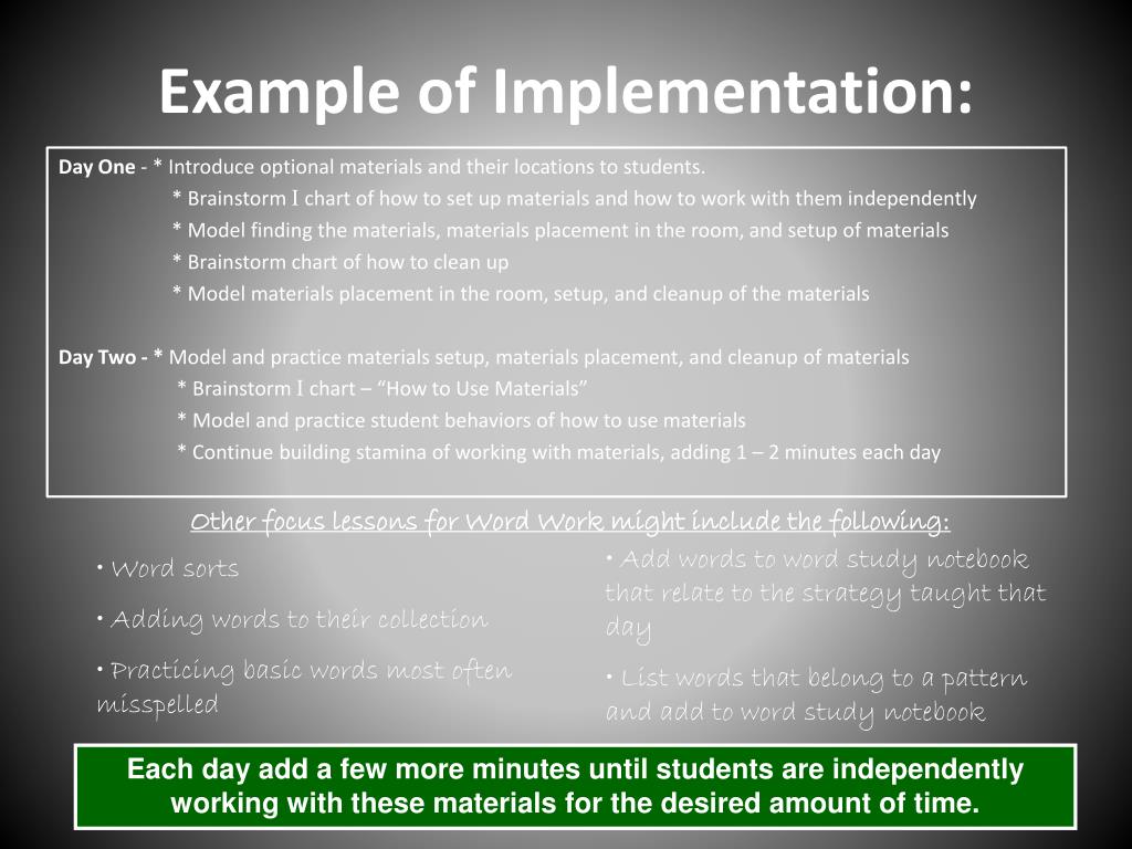 Day One - * Introduce optional materials and their locations to students. * Brainstorm I chart of how to set up materials and how to work with them independently * Model finding the materials, materials placement in the room, and setup of materials * Brainstorm chart of how to clean up * Model materials placement in the room, setup, and cleanup of the materials Day Two - * Model and practice materials setup, materials placement, and cleanup of materials * Brainstorm I chart – “How to Use Materials” * Model and practice student behaviors of how to use materials * Continue building stamina of working with materials, adding 1 – 2 minutes each day Example of Implementation: Other focus lessons for Word Work might include the following: • Add words to word study notebook that relate to the strategy taught that day • List words that belong to a pattern and add to word study notebook • Word sorts • Adding words to their collection • Practicing basic words most often misspelled Each day add a few more minutes until students are independently working with these materials for the desired amount of time.