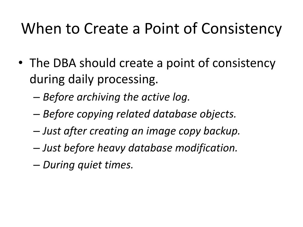 When to Create a Point of Consistency • The DBA should create a point of consistency during daily processing. • Before archiving the active log. • Before copying related database objects. • Just after creating an image copy backup. • Just before heavy database modification. • During quiet times.