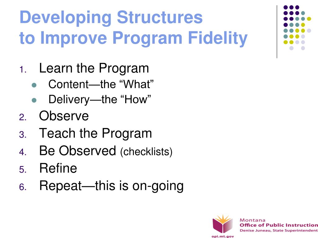 Developing Structuresto Improve Program Fidelity • Learn the Program • Content—the “What” • Delivery—the “How” • Observe • Teach the Program • Be Observed (checklists) • Refine • Repeat—this is on-going
