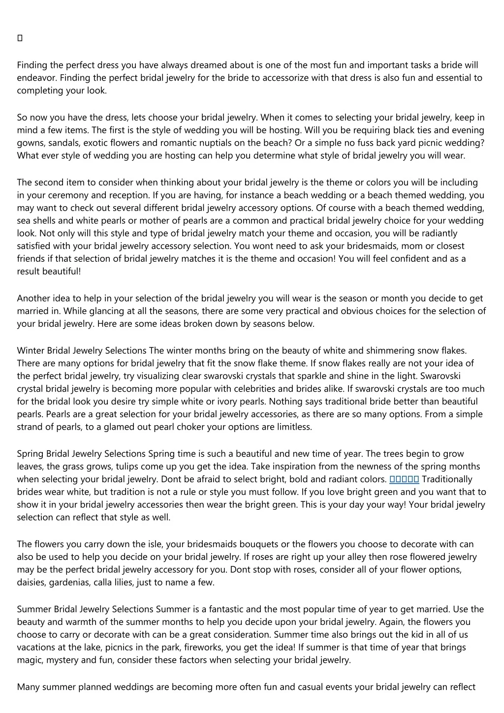 Finding the perfect dress you have always dreamed about is one of the most fun and important tasks a bride will endeavor. Finding the perfect bridal jewelry for the bride to accessorize with that dress is also fun and essential to completing your look. So now you have the dress, lets choose your bridal jewelry. When it comes to selecting your bridal jewelry, keep in mind a few items. The first is the style of wedding you will be hosting. Will you be requiring black ties and evening gowns, sandals, exotic flowers and romantic nuptials on the beach? Or a simple no fuss back yard picnic wedding? What ever style of wedding you are hosting can help you determine what style of bridal jewelry you will wear. The second item to consider when thinking about your bridal jewelry is the theme or colors you will be including in your ceremony and reception. If you are having, for instance a beach wedding or a beach themed wedding, you may want to check out several different bridal jewelry accessory options. Of course with a beach themed wedding, sea shells and white pearls or mother of pearls are a common and practical bridal jewelry choice for your wedding look. Not only will this style and type of bridal jewelry match your theme and occasion, you will be radiantly satisfied with your bridal jewelry accessory selection. You wont need to ask your bridesmaids, mom or closest friends if that selection of bridal jewelry matches it is the theme and occasion! You will feel confident and as a result beautiful! Another idea to help in your selection of the bridal jewelry you will wear is the season or month you decide to get married in. While glancing at all the seasons, there are some very practical and obvious choices for the selection of your bridal jewelry. Here are some ideas broken down by seasons below. Winter Bridal Jewelry Selections The winter months bring on the beauty of white and shimmering snow flakes. There are many options for bridal jewelry that fit the snow flake theme. If snow flakes really are not your idea of the perfect bridal jewelry, try visualizing clear swarovski crystals that sparkle and shine in the light. Swarovski crystal bridal jewelry is becoming more popular with celebrities and brides alike. If swarovski crystals are too much for the bridal look you desire try simple white or ivory pearls. Nothing says traditional bride better than beautiful pearls. Pearls are a great selection for your bridal jewelry accessories, as there are so many options. From a simple strand of pearls, to a glamed out pearl choker your options are limitless. Spring Bridal Jewelry Selections Spring time is such a beautiful and new time of year. The trees begin to grow leaves, the grass grows, tulips come up you get the idea. Take inspiration from the newness of the spring months when selecting your bridal jewelry. Dont be afraid to select bright, bold and radiant colors. 노노노노노 Traditionally brides wear white, but tradition is not a rule or style you must follow. If you love bright green and you want that to show it in your bridal jewelry accessories then wear the bright green. This is your day your way! Your bridal jewelry selection can reflect that style as well. The flowers you carry down the isle, your bridesmaids bouquets or the flowers you choose to decorate with can also be used to help you decide on your bridal jewelry. If roses are right up your alley then rose flowered jewelry may be the perfect bridal jewelry accessory for you. Dont stop with roses, consider all of your flower options, daisies, gardenias, calla lilies, just to name a few. Summer Bridal Jewelry Selections Summer is a fantastic and the most popular time of year to get married. Use the beauty and warmth of the summer months to help you decide upon your bridal jewelry. Again, the flowers you choose to carry or decorate with can be a great consideration. Summer time also brings out the kid in all of us vacations at the lake, picnics in the park, fireworks, you get the idea! If summer is that time of year that brings magic, mystery and fun, consider these factors when selecting your bridal jewelry. Many summer planned weddings are becoming more often fun and casual events your bridal jewelry can reflect