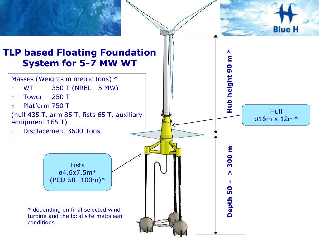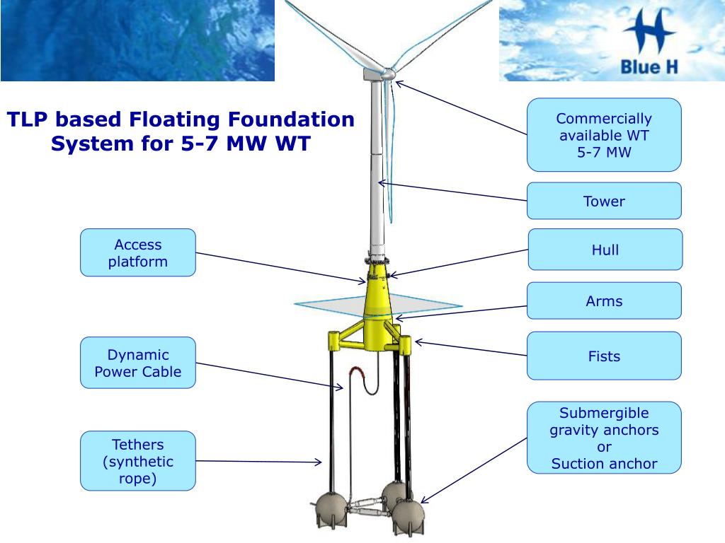 Blue H floating wind deep-water foundation Since 2004 has the previous Blue H group been active in the development of the TLP concept for floating wind, as well as in the development of offshore floating wind farms, originally started for deployment in the Mediterranean Sea. Blue H Engineering has been driving its product design process to secure a market acceptable return on investment, in specific for low wind sites at sea as well as for harsh North Sea and Ocean environments for wind turbine capacities over 5MW. The for series manufacturing designed offshore wind TLP is the most stable (for turbine with large rotor diameters), robust and economical attractive foundation model for deep-water (>50m) applications .