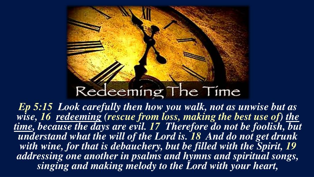 Ep 5:15 Look carefully then how you walk, not as unwise but as wise, 16redeeming (rescue from loss, making the best use of) the time, because the days are evil. 17Therefore do not be foolish, but understand what the will of the Lord is. 18And do not get drunk with wine, for that is debauchery, but be filled with the Spirit, 19addressing one another in psalms and hymns and spiritual songs, singing and making melody to the Lord with your heart,