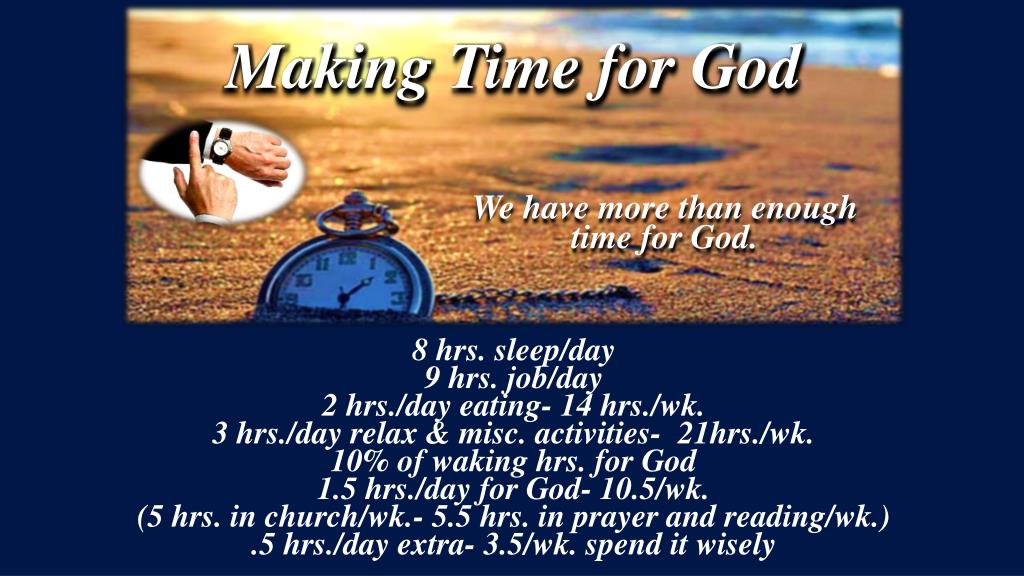 Making Time for God • We have more than enough • time for God. 8 hrs. sleep/day 9 hrs. job/day 2 hrs./day eating- 14 hrs./wk. 3 hrs./day relax & misc. activities- 21hrs./wk. 10% of waking hrs. for God 1.5 hrs./day for God- 10.5/wk. (5 hrs. in church/wk.- 5.5 hrs. in prayer and reading/wk.) .5 hrs./day extra- 3.5/wk. spend it wisely