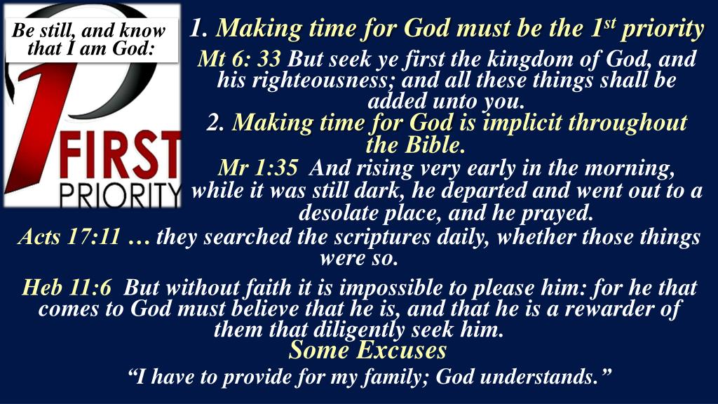 Be still, and know that I am God: 1. Making time for God must be the 1stpriority Mt 6: 33 But seek ye first the kingdom of God, and his righteousness; and all these things shall be added unto you. 2. Making time for God is implicit throughout the Bible. Mr 1:35 And rising very early in the morning, while it was still dark, he departed and went out to a desolate place, and he prayed. • Acts 17:11 … they searched the scriptures daily, whether those things were so. • Heb 11:6 But without faith it is impossible to please him: for he that comes to God must believe that he is, and that he is a rewarder of them that diligently seek him. • Some Excuses • “I have to provide for my family; God understands.”