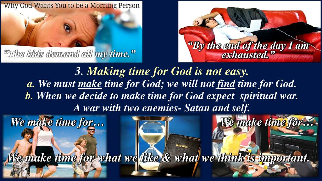 “By the end of the day I am exhausted.” • “The kids demand all my time.” • 3. Making time for God is not easy. • a. We must maketime for God; we will not find time for God. • b. When we decide to make time for God expect spiritual war. • A war with two enemies- Satan and self. • We make time for… • We make time for… • We make time for what we like & what we think is important.