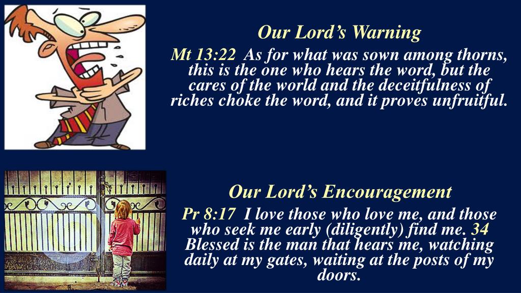 Our Lord’s Warning Mt 13:22 As for what was sown among thorns, this is the one who hears the word, but the cares of the world and the deceitfulness of riches choke the word, and it proves unfruitful. • Our Lord’s Encouragement • Pr 8:17 I love those who love me, and those who seek me early (diligently) find me. 34Blessed is the man that hears me, watching daily at my gates, waiting at the posts of my doors.
