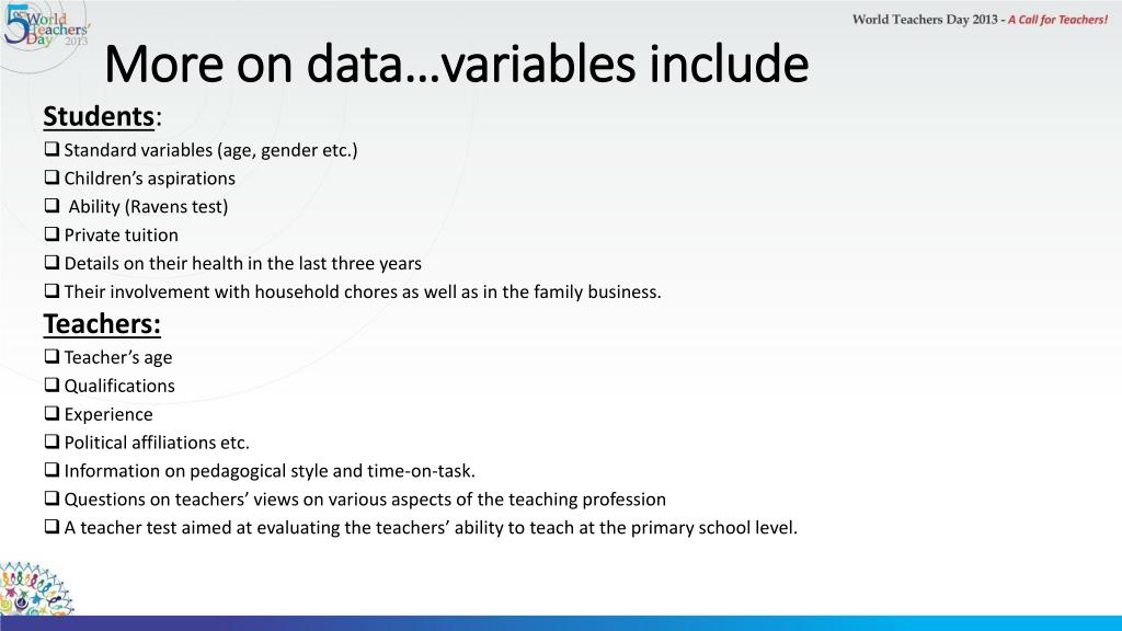 More on data…variables include Students: • Standard variables (age, gender etc.) • Children’s aspirations • Ability (Ravens test) • Private tuition • Details on their health in the last three years • Their involvement with household chores as well as in the family business. Teachers: • Teacher’s age • Qualifications • Experience • Political affiliations etc. • Information on pedagogical style and time-on-task. • Questions on teachers’ views on various aspects of the teaching profession • A teacher test aimed at evaluating the teachers’ ability to teach at the primary school level.