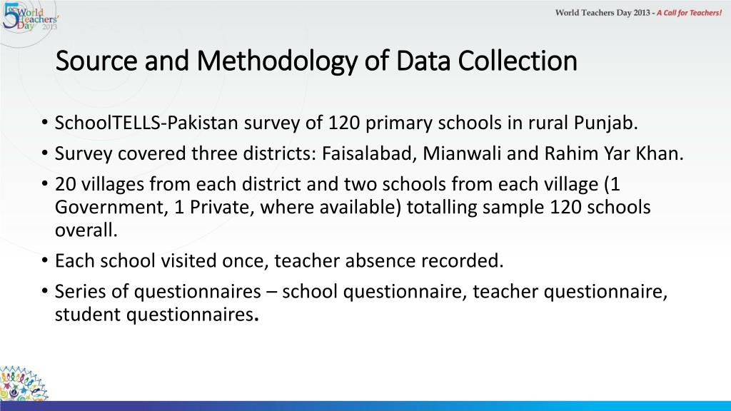 Source and Methodology of Data Collection • SchoolTELLS-Pakistan survey of 120 primary schools in rural Punjab. • Survey covered three districts: Faisalabad, Mianwali and RahimYar Khan. • 20 villages from each district and two schools from each village (1 Government, 1 Private, where available) totalling sample 120 schools overall. • Each school visited once, teacher absence recorded. • Series of questionnaires – school questionnaire, teacher questionnaire, student questionnaires.