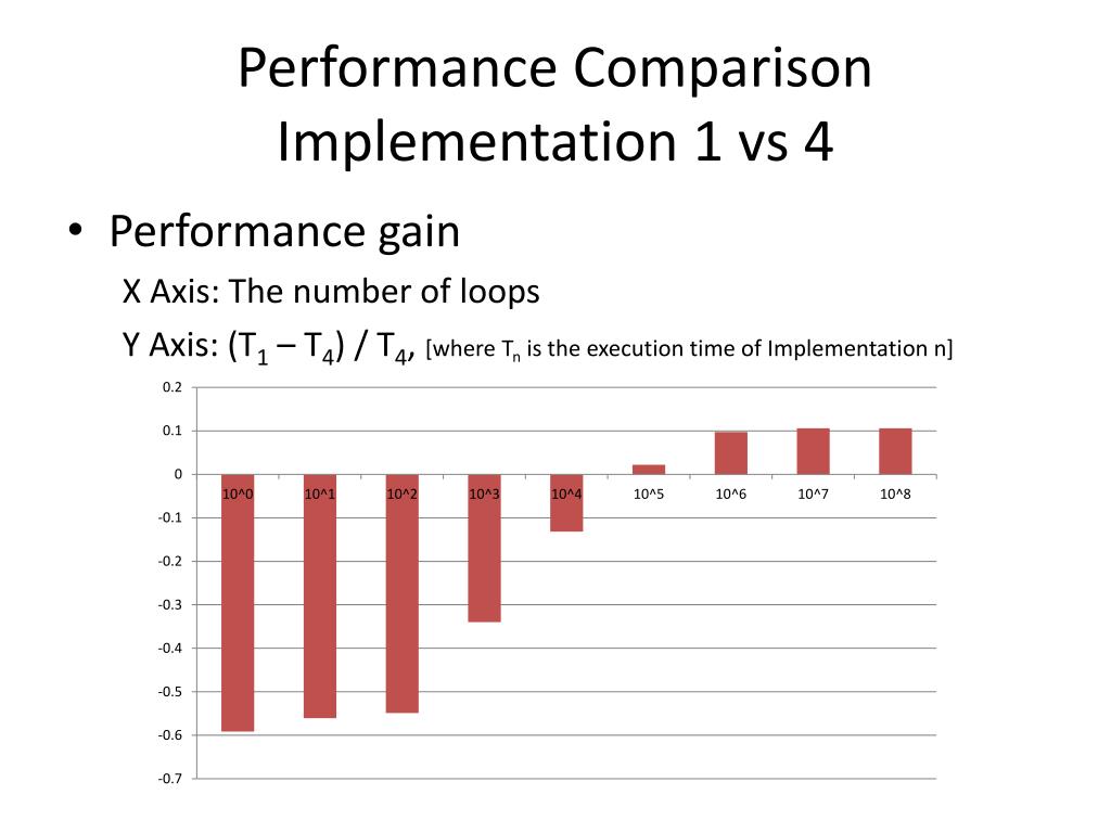 Performance ComparisonImplementation 1 vs 4 • Performance gain X Axis: The number of loops Y Axis: (T1 – T4) / T4, [where Tn is the execution time of Implementation n]
