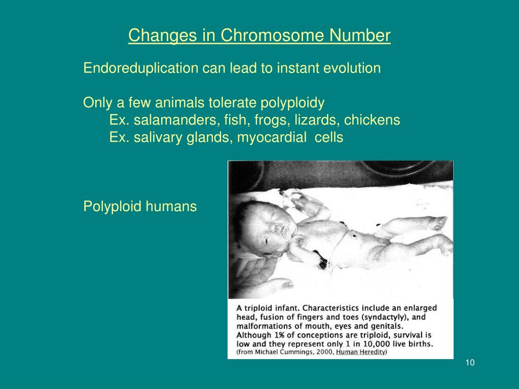 Changes in Chromosome Number Endoreduplication can lead to instant evolution Only a few animals tolerate polyploidy Ex. salamanders, fish, frogs, lizards, chickens Ex. salivary glands, myocardial cells Polyploid humans 10