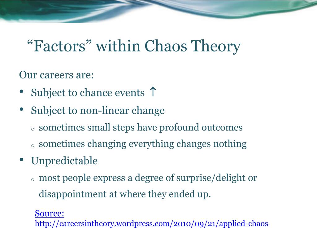 Source:http://careersintheory.wordpress.com/2010/09/21/applied-chaosSource:http://careersintheory.wordpress.com/2010/09/21/applied-chaos “Factors” within Chaos Theory Our careers are: • Subject to chance events • Subject to non-linear change • sometimes small steps have profound outcomes • sometimes changing everything changes nothing • Unpredictable • most people express a degree of surprise/delight or disappointment at where they ended up.