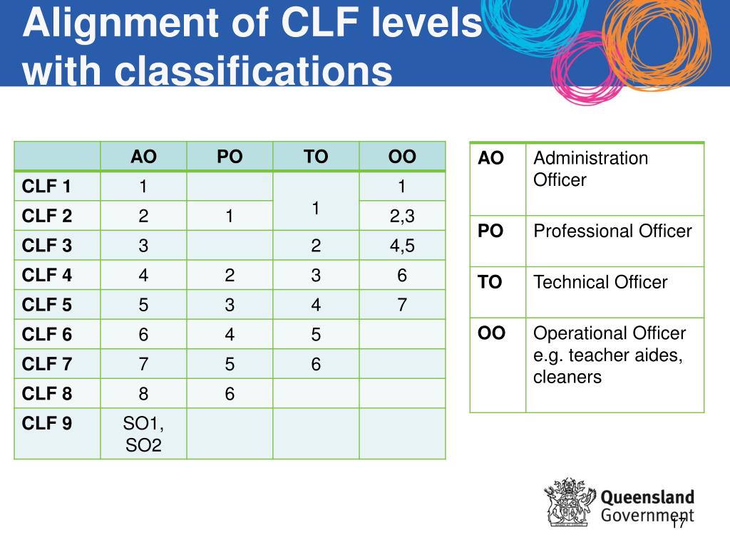 What is the CLF? The CLF is a tool that: • demonstrates the capabilities required of public service employees (except teachers, school leaders, Senior Executive Service and the Chief Executive who each have their own capability frameworks) • provides a common language about capability for individuals and Queensland government agencies • describes behaviours expected of people working in the Queensland public service at all classification levels.