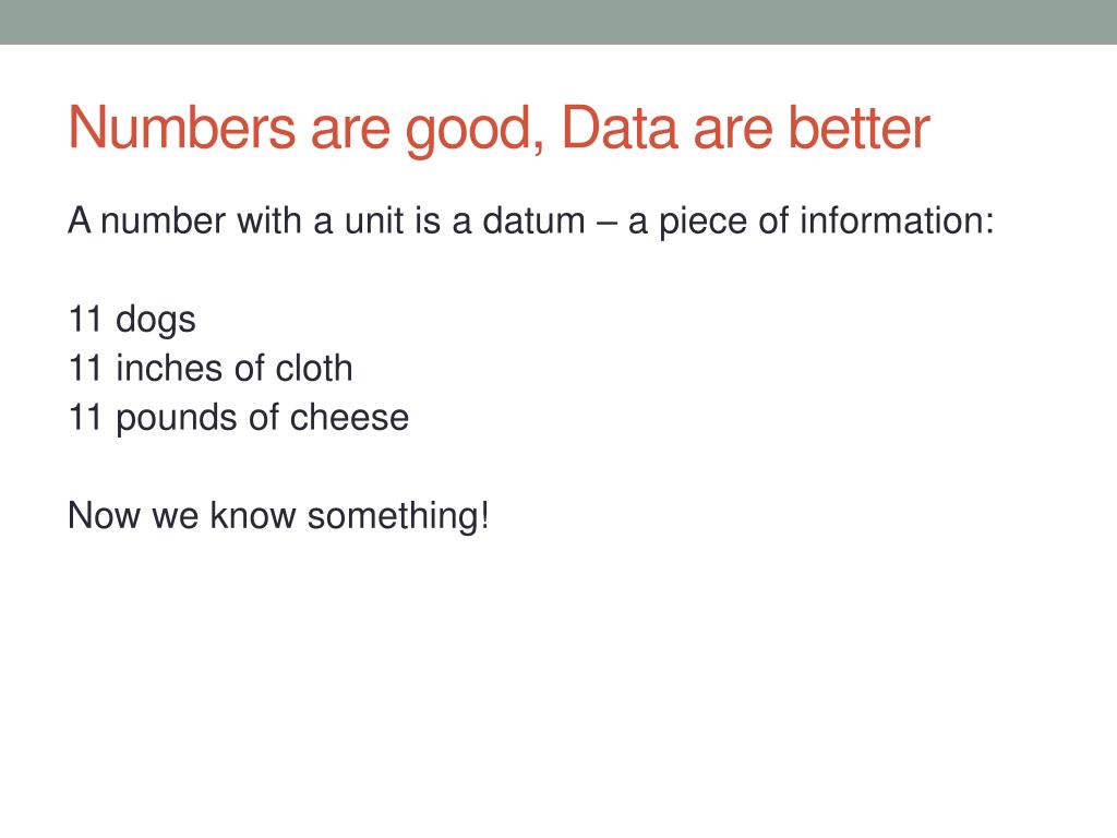 Numbers are good, Data are better A number with a unit is a datum – a piece of information: 11 dogs 11 inches of cloth 11 pounds of cheese Now we know something!