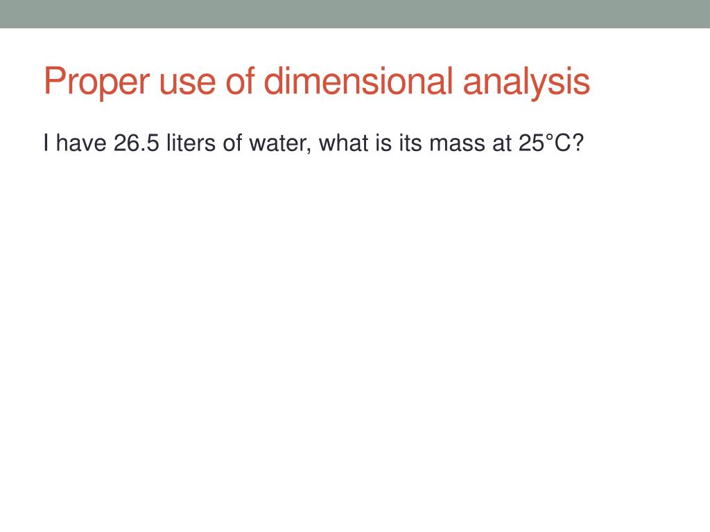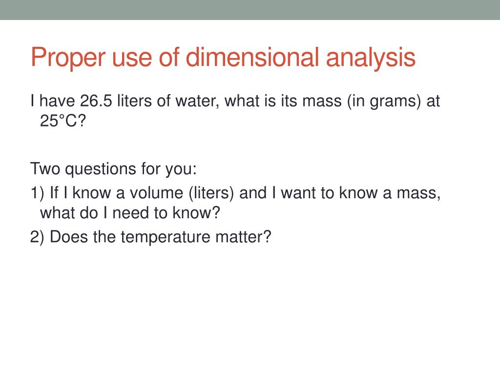 Proper use of dimensional analysis I have 26.5 liters of water, what is its mass (in grams) at 25°C? Two questions for you: 1) If I know a volume (liters) and I want to know a mass, what do I need to know? 2) Does the temperature matter?