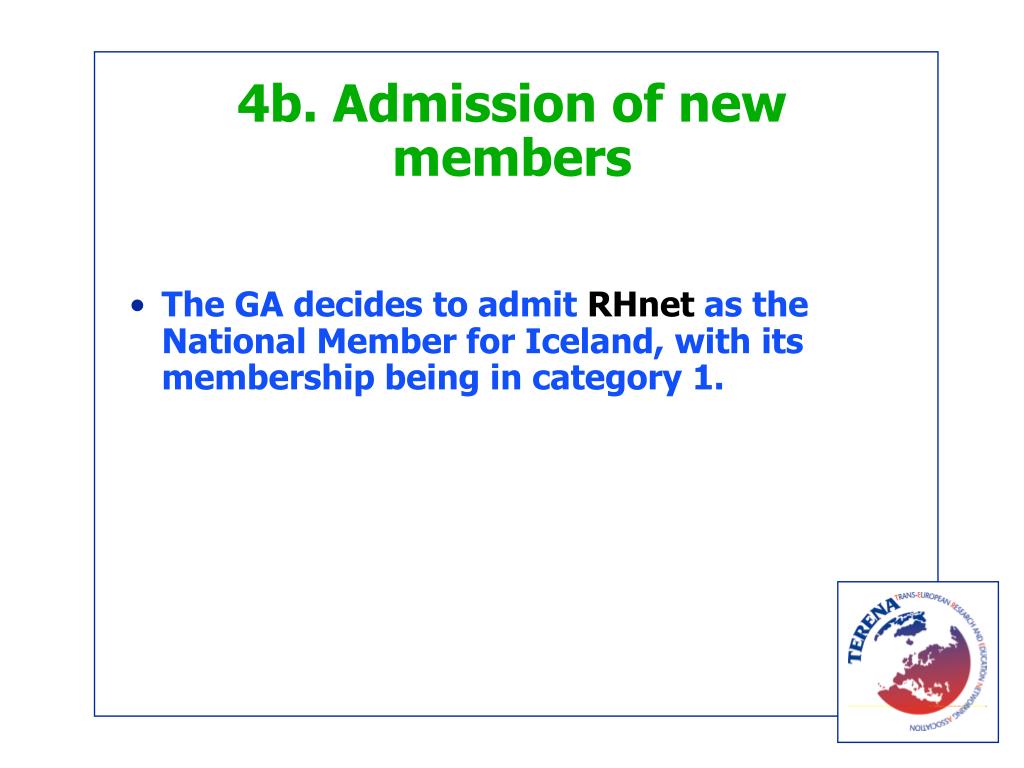 4b. Admission of new members • The GA decides to admit RHnet as the National Member for Iceland, with its membership being in category 1.