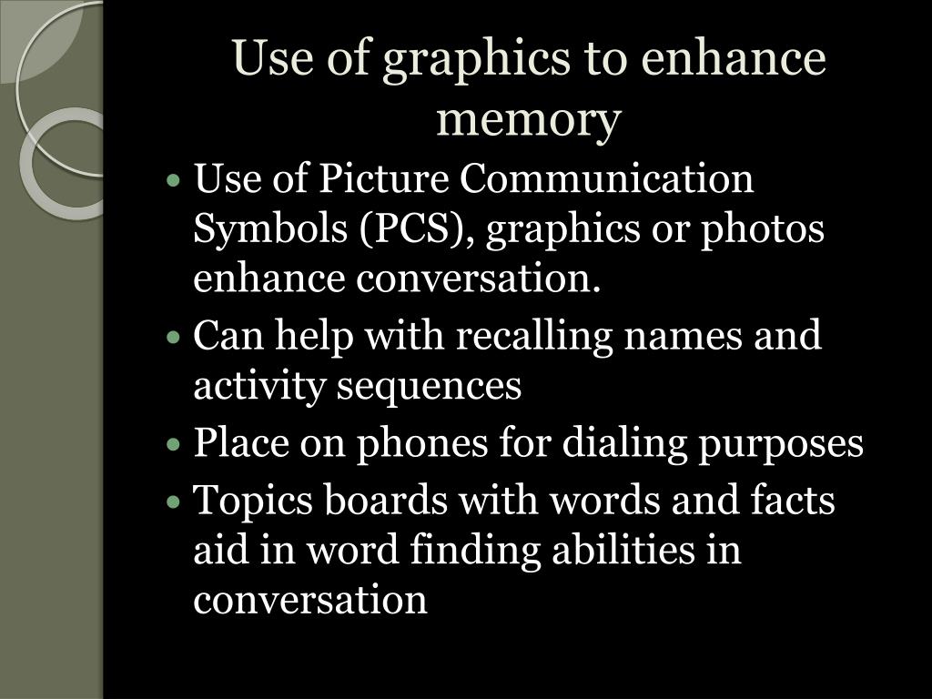 Use of graphics to enhance memory • Use of Picture Communication Symbols (PCS), graphics or photos enhance conversation. • Can help with recalling names and activity sequences • Place on phones for dialing purposes • Topics boards with words and facts aid in word finding abilities in conversation