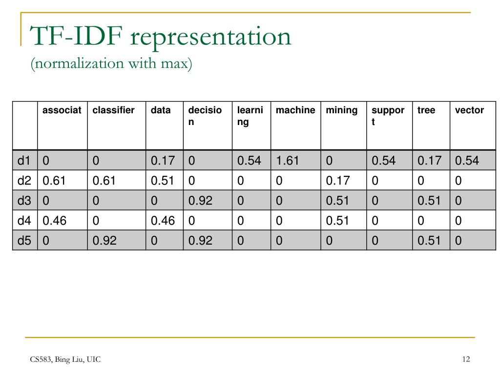 TF-IDF representation(normalization with max) CS583, Bing Liu, UIC