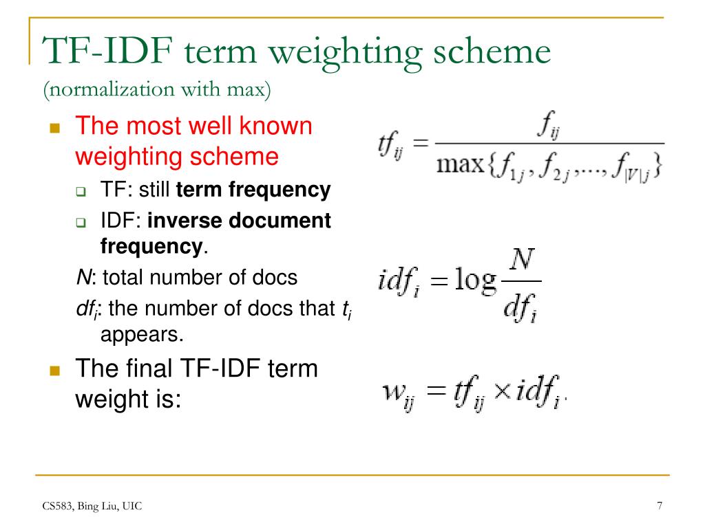 TF-IDF term weighting scheme(normalization with max) • The most well known weighting scheme • TF: still term frequency • IDF: inverse document frequency. N: total number of docs dfi: the number of docs that ti appears. • The final TF-IDF term weight is: CS583, Bing Liu, UIC
