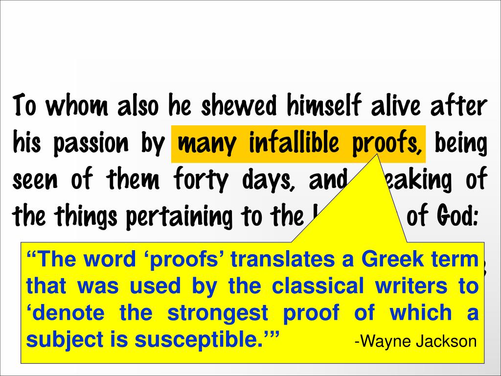 To whom also he shewed himself alive after his passion by many infallible proofs, being seen of them forty days, and speaking of the things pertaining to the kingdom of God: Acts 1:3 “The word ‘proofs’ translates a Greek term that was used by the classical writers to ‘denote the strongest proof of which a subject is susceptible.’”-Wayne Jackson