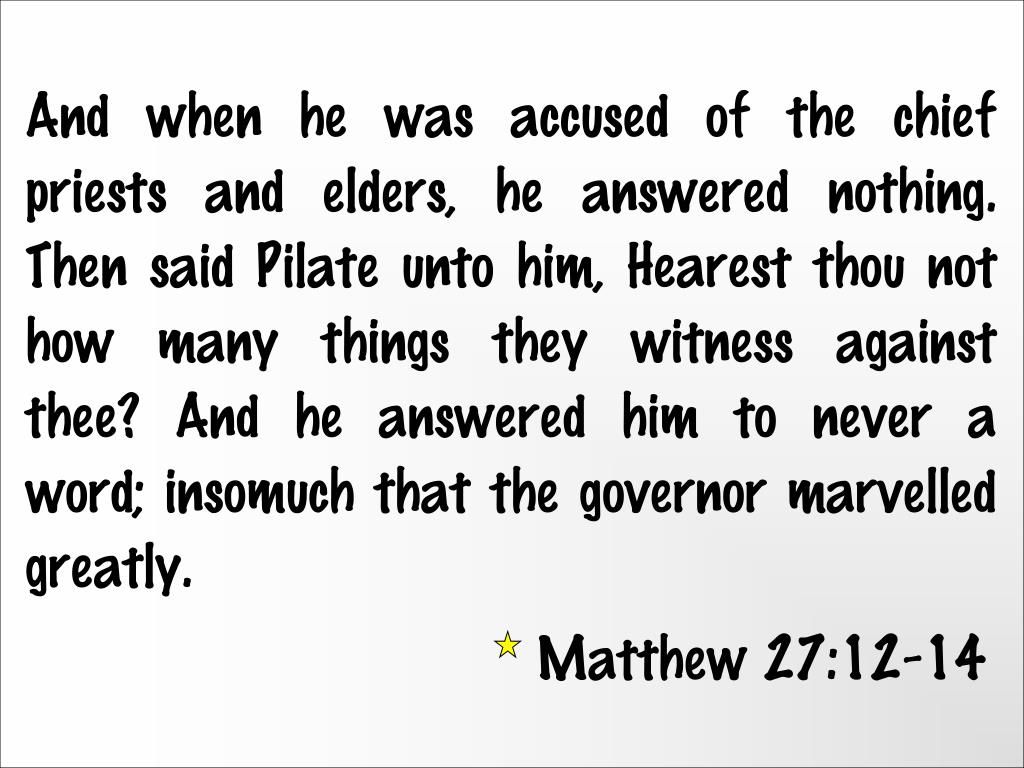 And when he was accused of the chief priests and elders, he answered nothing. Then said Pilate unto him, Hearest thou not how many things they witness against thee? And he answered him to never a word; insomuch that the governor marvelled greatly. Matthew 27:12-14