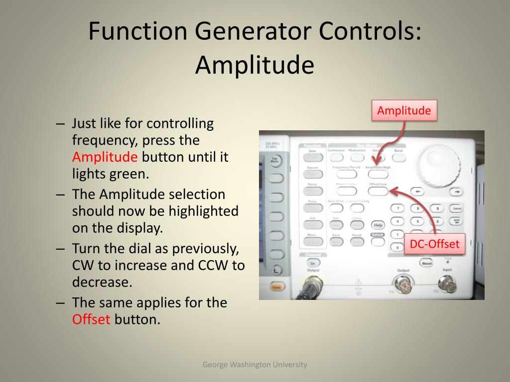 Function Generator Controls 5 Volts Peak-to-Peak 2 Volts Peak-to-Peak 2.5 Volt Amplitude 1 Volt Amplitude Not only can we change the shape and frequency of a wave, but we can also change the amplitude. George Washington University
