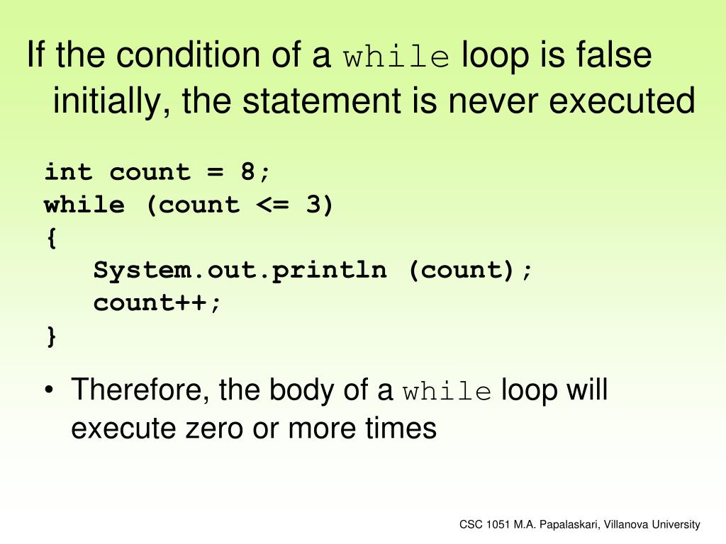 If the condition of a while loop is false initially, the statement is never executed int count = 8; while (count <= 3) { System.out.println (count); count++; } • Therefore, the body of a while loop will execute zero or more times CSC 1051 M.A. Papalaskari, Villanova University