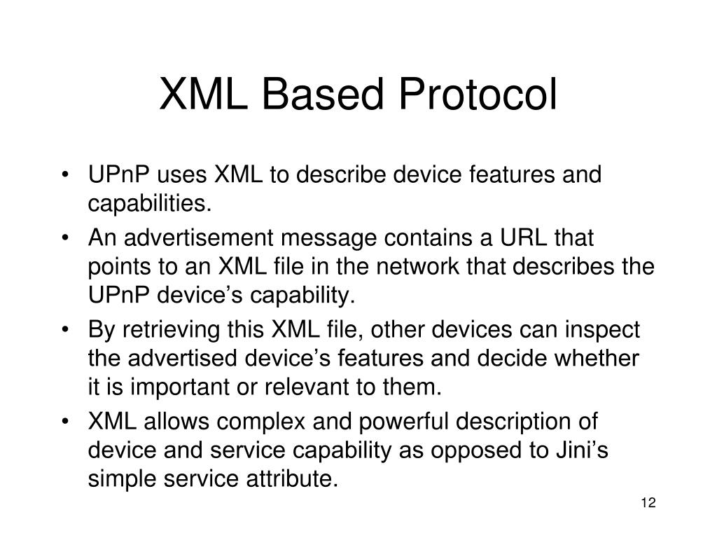 XML Based Protocol • UPnP uses XML to describe device features and capabilities. • An advertisement message contains a URL that points to an XML file in the network that describes the UPnP device’s capability. • By retrieving this XML file, other devices can inspect the advertised device’s features and decide whether it is important or relevant to them. • XML allows complex and powerful description of device and service capability as opposed to Jini’s simple service attribute.