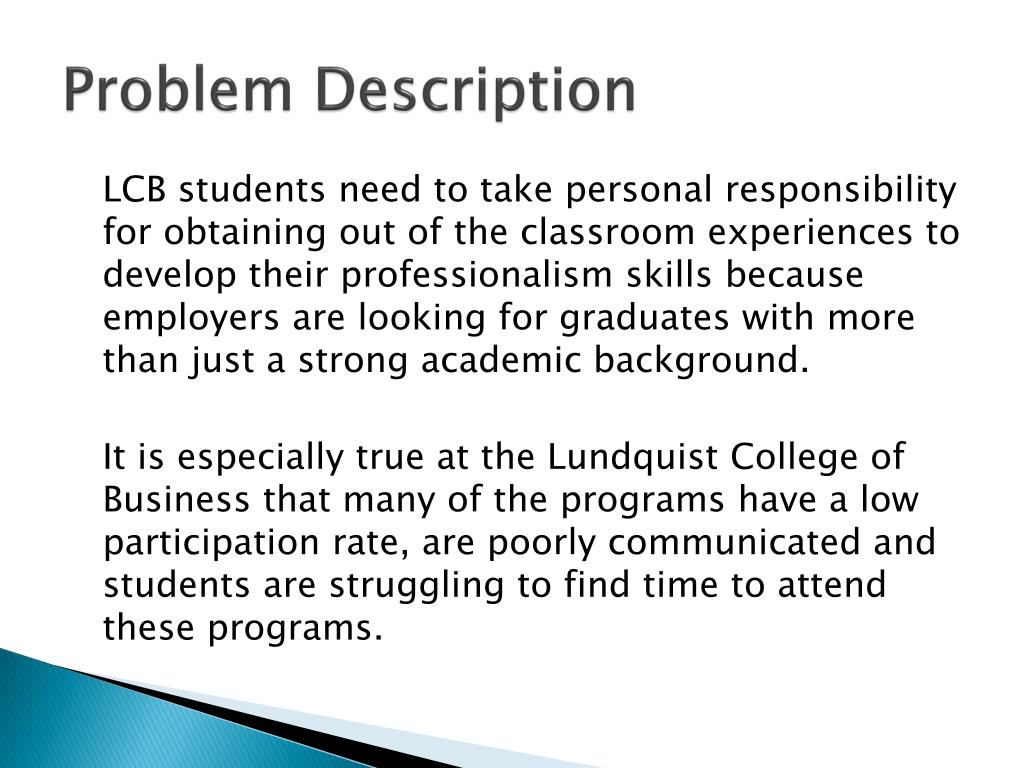 Problem Description LCB students need to take personal responsibility for obtaining out of the classroom experiences to develop their professionalism skills because employers are looking for graduates with more than just a strong academic background. It is especially true at the Lundquist College of Business that many of the programs have a low participation rate, are poorly communicated and students are struggling to find time to attend these programs.