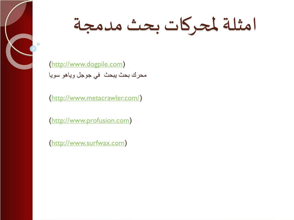 امثلة لمحركات بحث مدمجة (http://www.dogpile.com) محرك بحث يبحث في جوجلوياهو سويا (http://www.metacrawler.com/) (http://www.profusion.com) (http://www.surfwax.com)