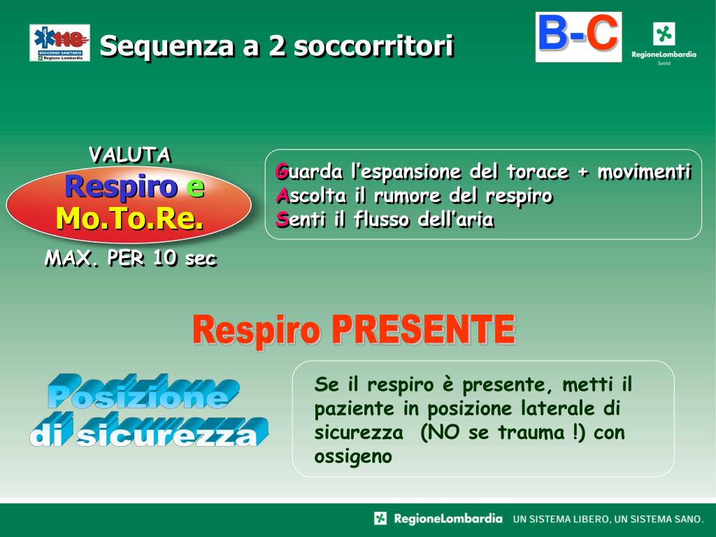 Sequenza a 2 soccorritori B-C VALUTA Guarda l’espansione del torace + movimenti Ascolta il rumore del respiro Senti il flusso dell’aria Respiroe Mo.To.Re. MAX. PER 10 sec Respiro PRESENTE Se il respiro è presente, metti il paziente in posizione laterale di sicurezza (NO se trauma !) con ossigeno Posizione di sicurezza