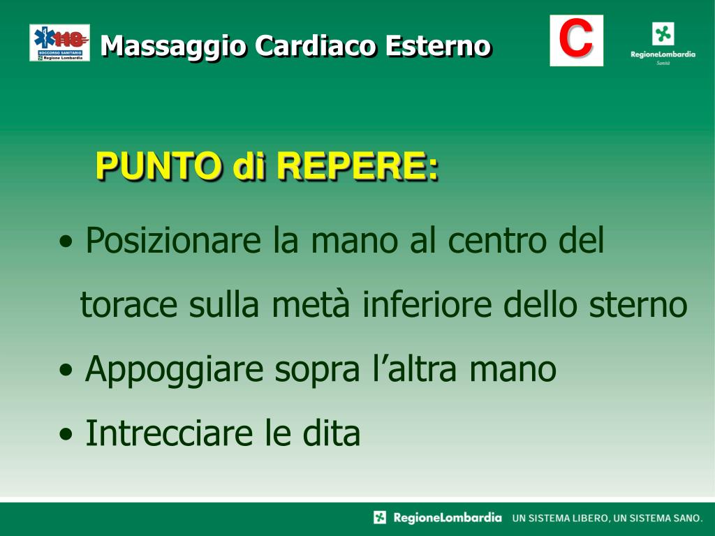 Massaggio Cardiaco Esterno C PUNTO di REPERE: • Posizionare la mano al centro del • torace sulla metà inferiore dello sterno • Appoggiare sopra l’altra mano • Intrecciare le dita