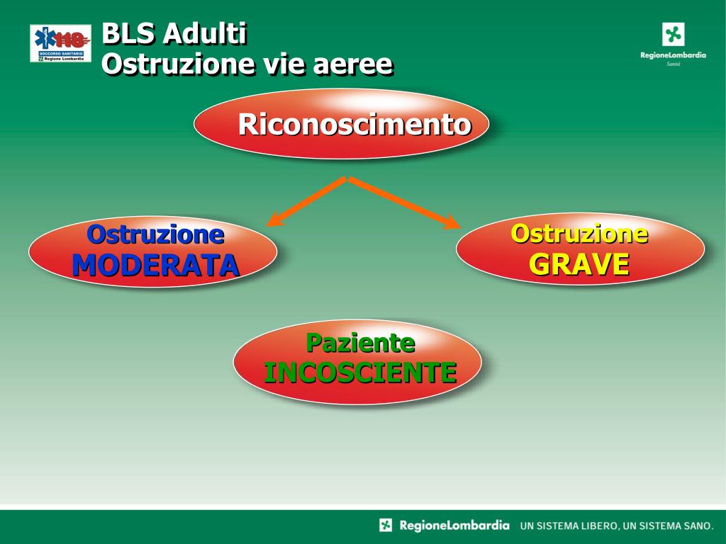 BLS AdultiOstruzione vie aeree Riconoscimento OstruzioneGRAVE OstruzioneMODERATA PazienteINCOSCIENTE