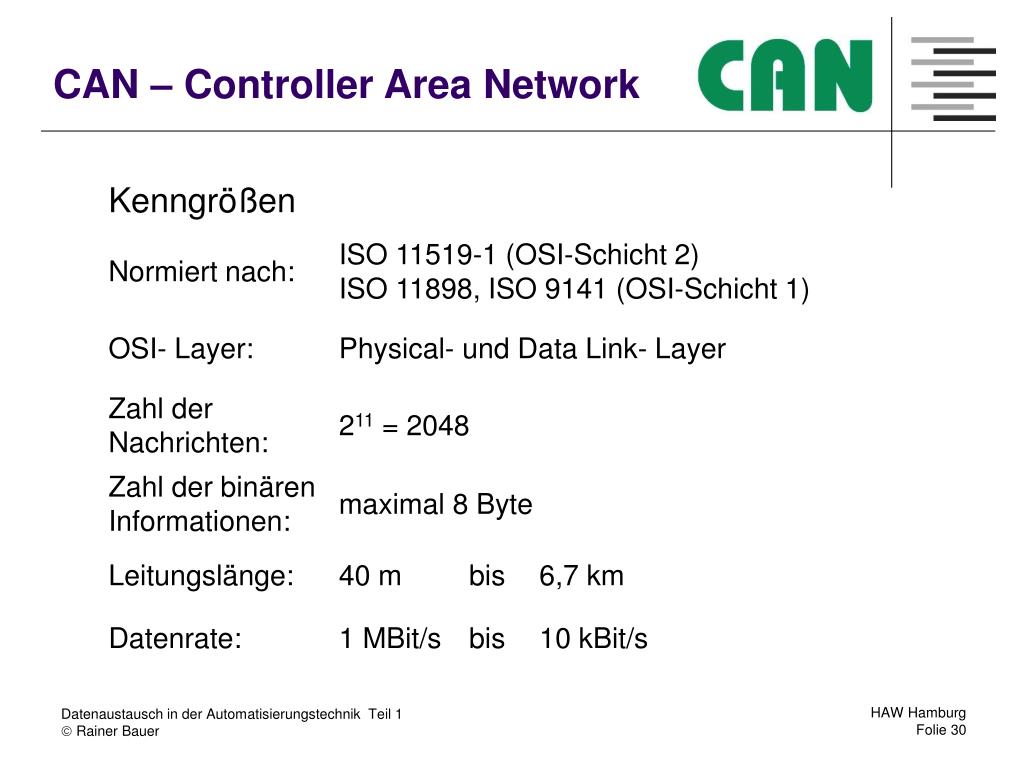 CAN – Controller Area Network Busarbitrierung Datenaustausch in der Automatisierungstechnik Teil 1  Rainer Bauer