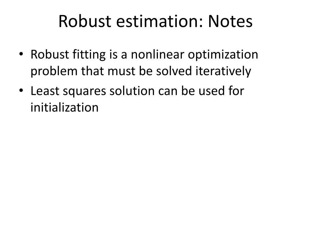Robust estimation: Notes • Robust fitting is a nonlinear optimization problem that must be solved iteratively • Least squares solution can be used for initialization